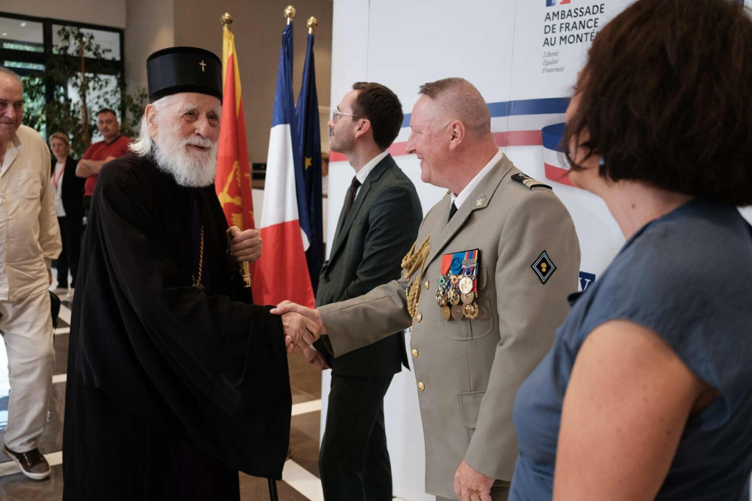 Na poziv Njene Ekselencije gospođe Anne Marie Maskay, ambasadorke Republike Francuske u Crnoj Gori, Arhiepiskop cetinjski i Mitropolit crnogorski, gospodin Mihailo, predvodio je svečanu delegaciju Crnogorske pravoslavne crkve na prijemu organizovanom povodom 14. jula – Dana Bastilje, nacionalnog praznika Francuske Republike.