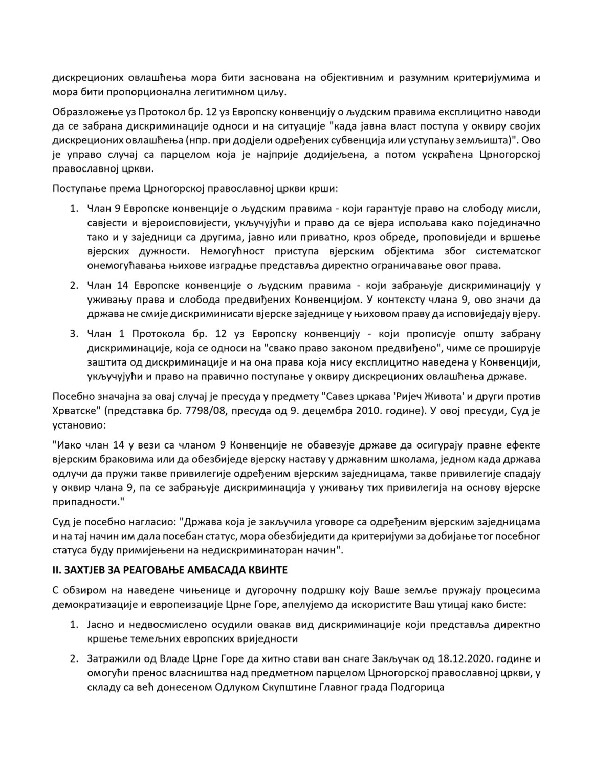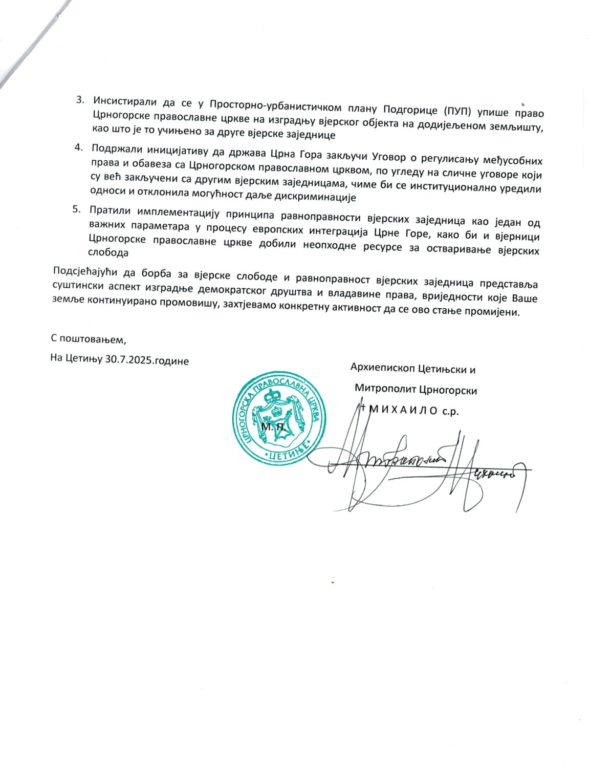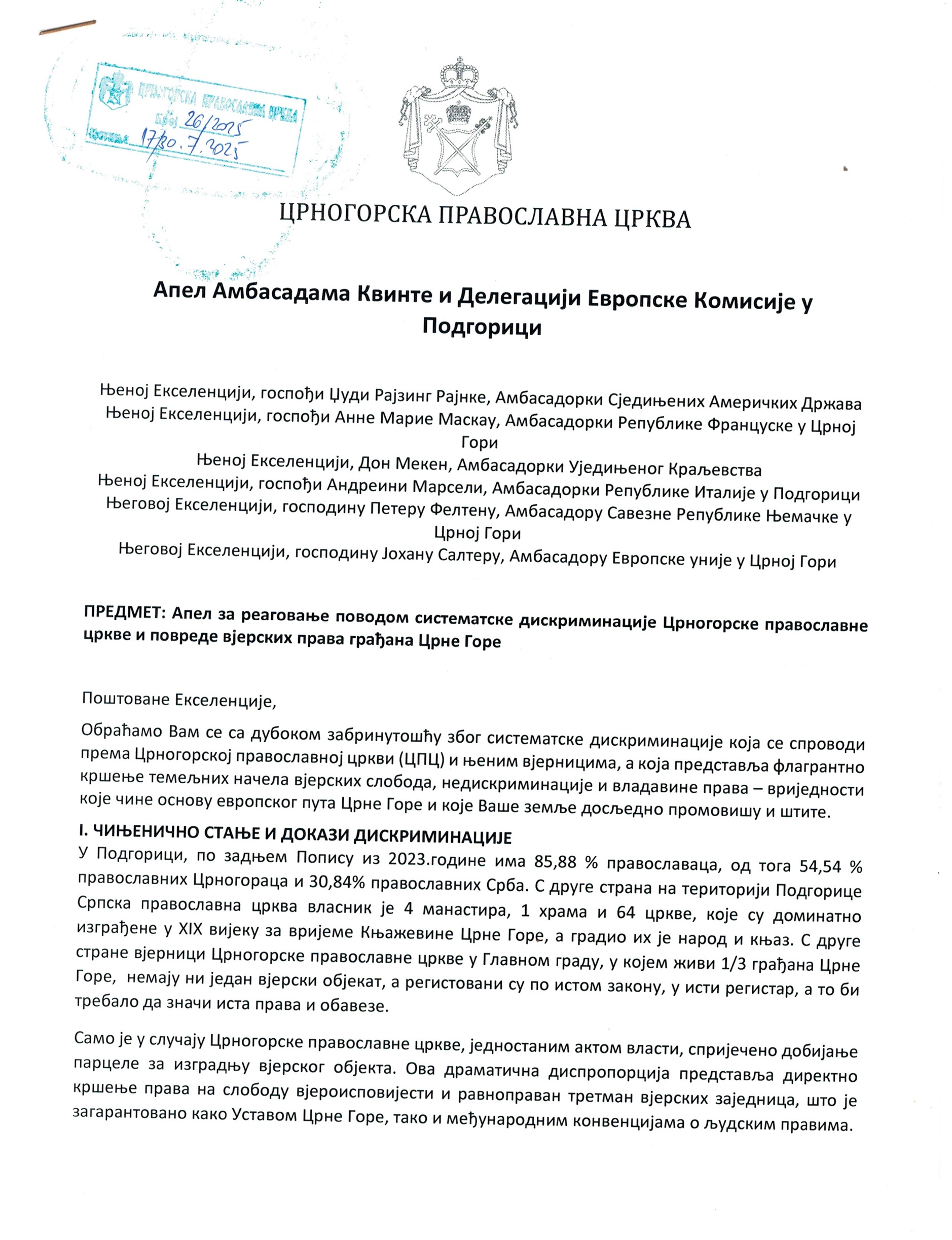 Obraćamo Vam se sa dubokom zabrinutošću zbog sistematske diskriminacije koja se sprovodi prema Crnogorskoj pravoslavnoj crkvi (CPC) i njenim vjernicima, a koja predstavlja flagrantno kršenje temeljnih načela vjerskih sloboda, nediskriminacije i vladavine prava – vrijednosti koje čine osnovu evropskog puta Crne Gore i koje Vaše zemlje dosljedno promovišu i štite.