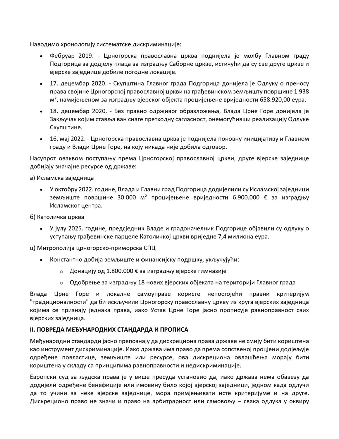 Samo je u slučaju Crnogorske pravoslavne crkve, jednostanim aktom vlasti, spriječeno dobijanje parcele za izgradnju vjerskog objekta. Ova dramatična disproporcija predstavlja direktno kršenje prava na slobodu vjeroispovijesti i ravnopravan tretman vjerskih zajednica, što je zagarantovano kako Ustavom Crne Gore, tako i međunarodnim konvencijama o ljudskim pravima.