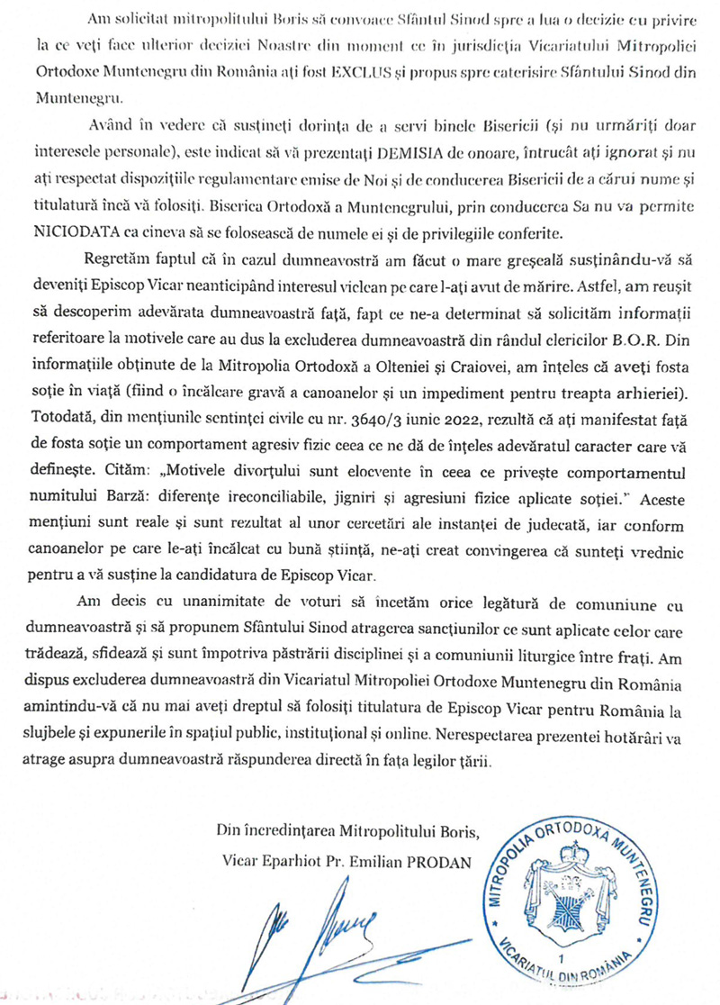 Bojović i lažni rumunski Vikarijat su zaključili da je Barza nastavio sa prevarama i nakon što mu je pružena “druga šansa”. U zvaničnom dokumentu o isključenju, tzv. Vikarijat Pravoslavne mitropolije Crnogorske u Rumuniji navodi: “Razumijemo da niste ništa naučili iz svoje (kontroverzne) prošlosti, a mnoge odluke i ponašanje koje ste pokazali prema nama identični su razlozima koje je navela Pravoslavna mitropolija Oltenija unutar Rumunske pravoslavne crkve kada vam je primijenjena kazna degradacije.”